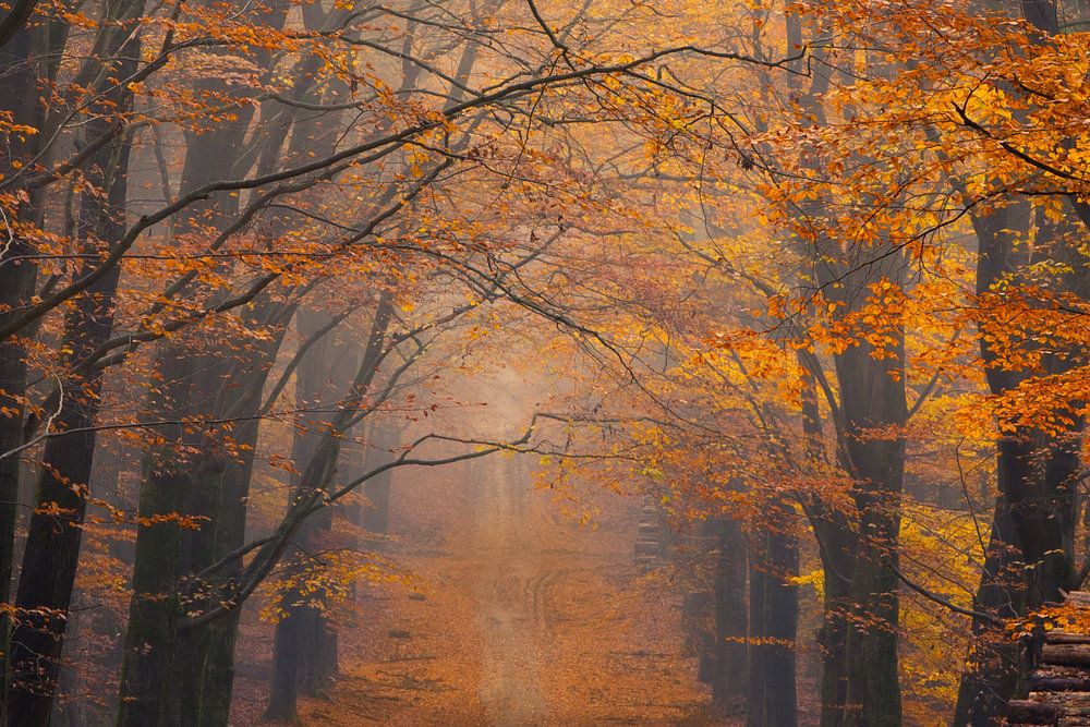 The trees are orange and create a new world. It is an old forest with many loose branches. The fog creates peace in the area,