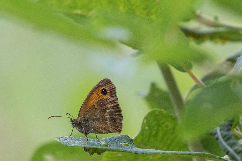 Klein oranje bruin vlindertje tussen de bladeren van een struik