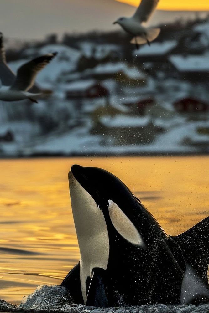 In this impressive image, a majestic orca rises above the glistening surface of the water, while the golden rays of the sun bathe the sky in a warm light. Surrounded by flying seagulls and snow-covered landscapes, the scene combines the power of nature with the tranquil beauty of the wilderness, inviting you to marvel.