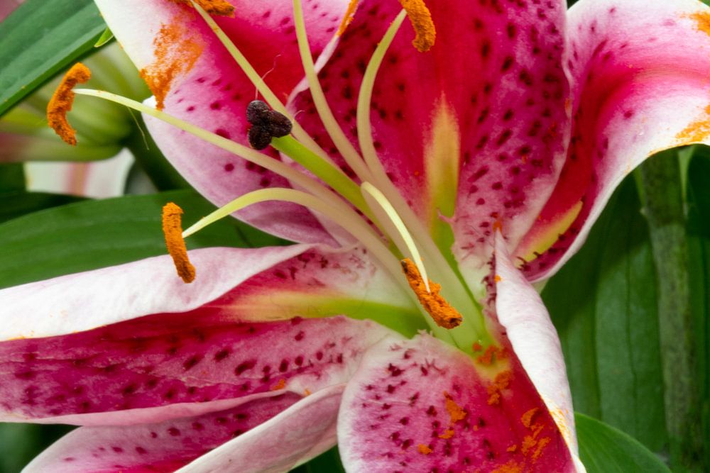 The pink color in this flower is deep and bright so the dark yellow pollen on the threads and the green leaves make a nice contrast.