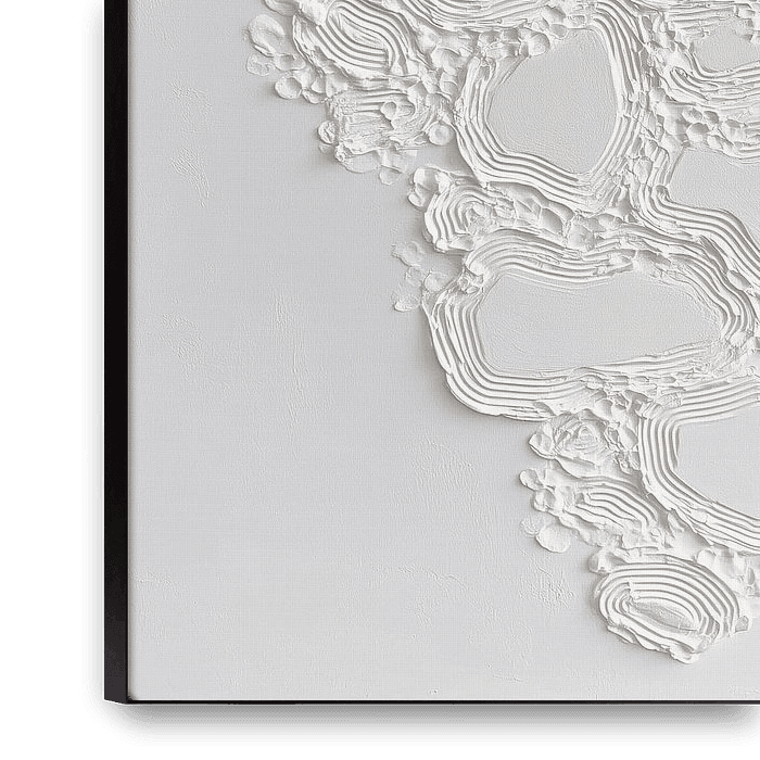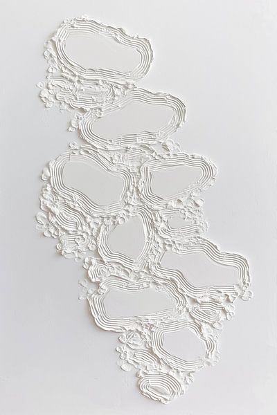 Dit minimalistische abstracte kunstwerk bestaat uit witte reliëfvormen die als organische lagen over het oppervlak lijken te liggen. De structuur is opgebouwd uit meerdere lijnen en randen die samen een natuurlijk en bijna steenachtig patroon vormen. Door het gebruik van één kleur ligt de nadruk volledig op textuur, vorm en lichtval,…