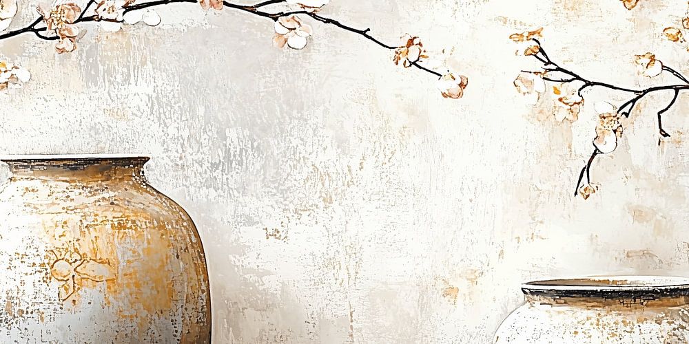 This artwork shows a serene still life with antique vases in earth tones, depicting delicate blossom branches. The composition exudes a tranquil elegance and simplicity, with a light, mother-of-pearl shine over the whole. It evokes a feeling of timeless beauty, a nod to the transience of nature.