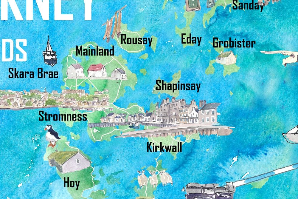 Orkney Islands Illustrated Travel Map with Tourist Highlights