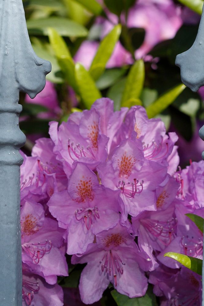 Decorated garden fence with pink flowering rhododendron, Bremen, Germany, Europe