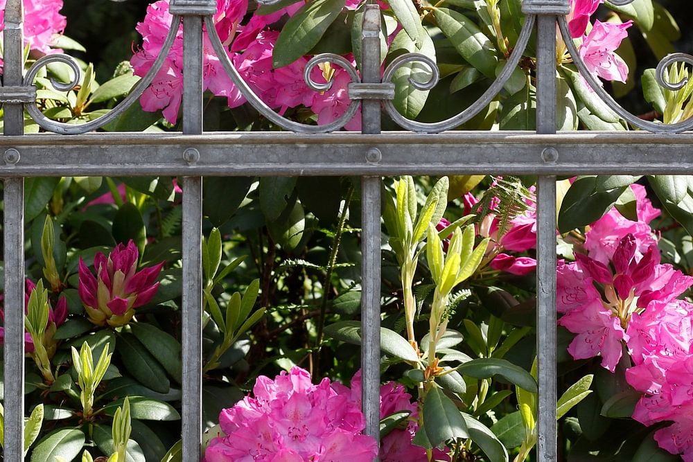 Decorated garden fence with pink flowering rhododendron, Bremen, Germany, Europe