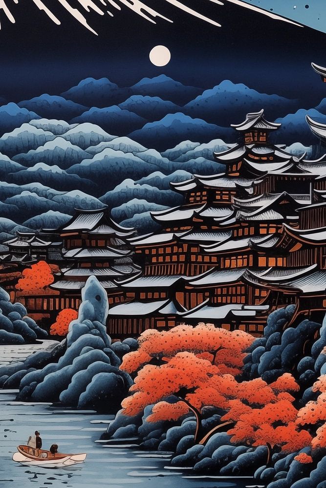 A work of art that captures Osaka's vibrant and cosmopolitan atmosphere. Neon lights illuminate the streets full of modern architecture and bustling activity, creating a futuristic and dynamic landscape that captures the essence of the city.