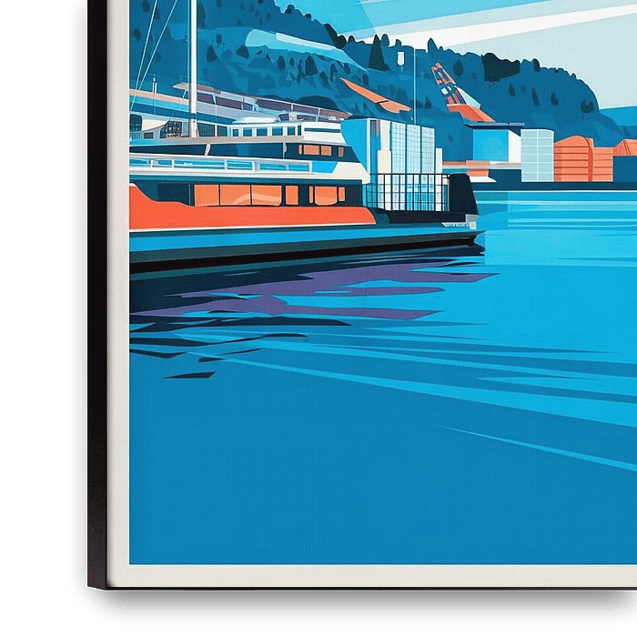 The picturesque coastline of Oslo unfolds in a harmonious interplay of soft blue and orange tones. The stylised mountains watch majestically over the gentle waves, while a charming water taxi enlivens the scenery. This graphic expression conveys the tranquillity and beauty of a city that oscillates between tradition and modernity. A…