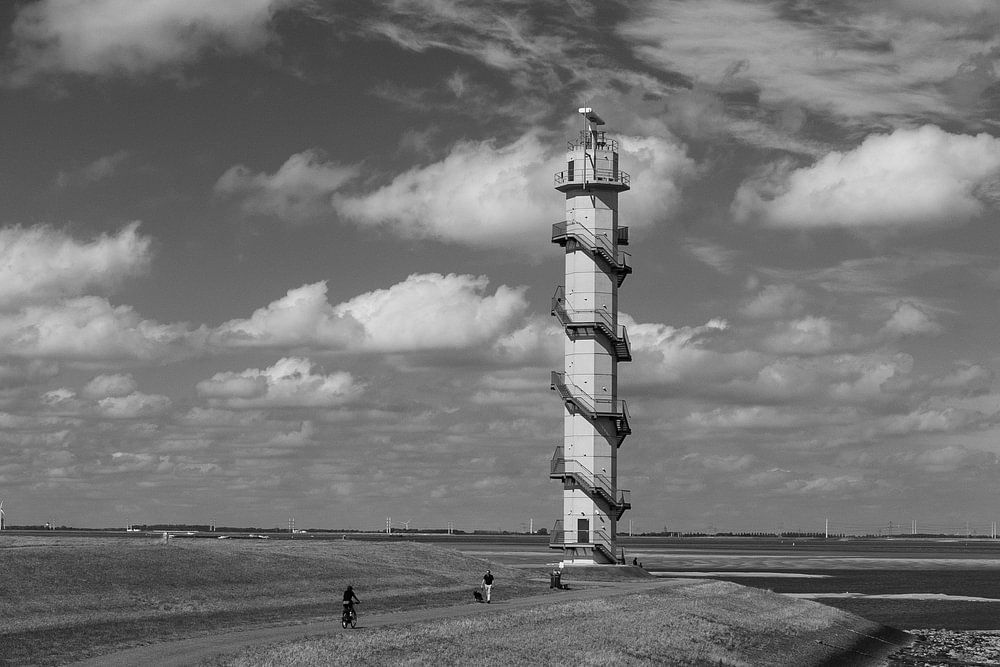 The Ossenisse Radar Tower overlooks the vast and serene landscape next to the Western Scheldt on the Sea dike near Hulst, Zeelandic Flanders, in the Netherlands. This black and white landscape photo captures the curve of the sea defense, with the towering structure standing as a symbol of strength and resilience against the ever-changing sky and clouds.