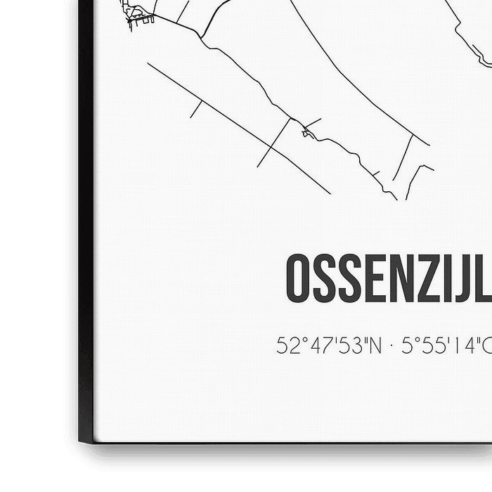 Black and white map, street map or street plan of Ossenzijl. Ossenzijl is located in the municipality of Steenwijkerland, province of Overijssel. On the city map all public roads in Ossenzijl are included. Furthermore, the map is provided with the coordinates of the center of Ossenzijl.