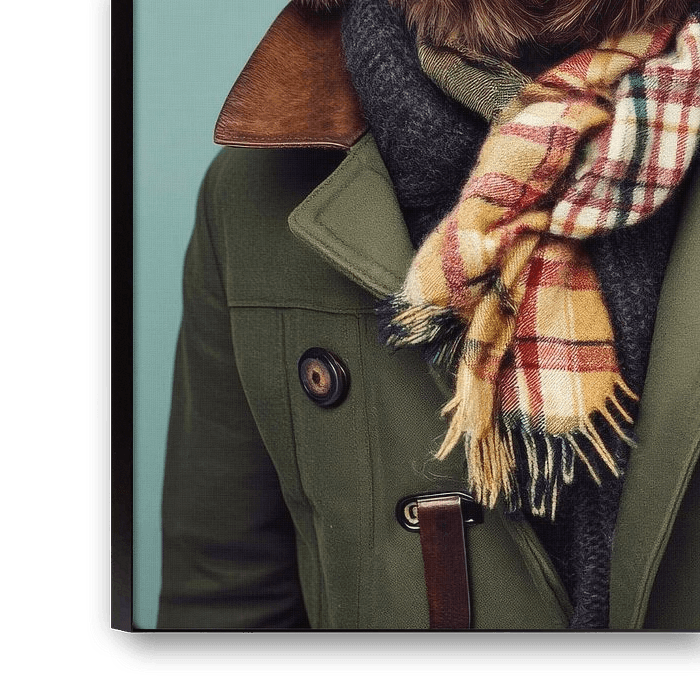 With a charming, tousled coat reminiscent of the gentle waves of a body of water, this Otterhound epitomises the perfect mix of warmth and style. His mischievous look is emphasised by an elegant hat and chequered scarf, giving him a disarming elegance - a true gentleman on four paws.