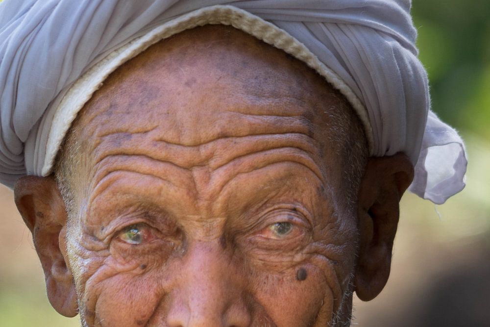 Oudste man van het dorp Nega Abady. Aantal kinderen onbekend. Wijs man, graag op de foto, liefst bij iedereen aan de muur.