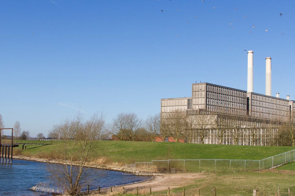 IJsselcentrale Zwolle in zijn landschap. De centrale wordt sinds 2016 gesloopt. Op de foto nog in oude 'glorie', met 2 van de - oorspronkelijk 5 - schoorstenen.