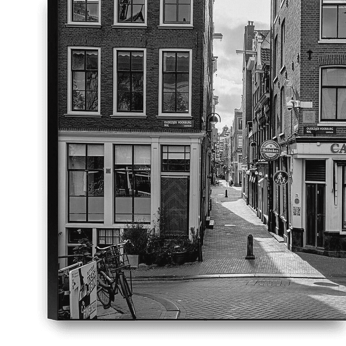 In the heart of Amsterdam opposite the Oudekerk is the Oudekennissteeg, a narrow street that connects the Oudezijds Voorburgwal with the Oudezijds Achterburgwal. On the left of this work is a beautiful canal house with a bell gable, on the right you can admire café Pleinzicht. This work can be ordered in both color and black and white.