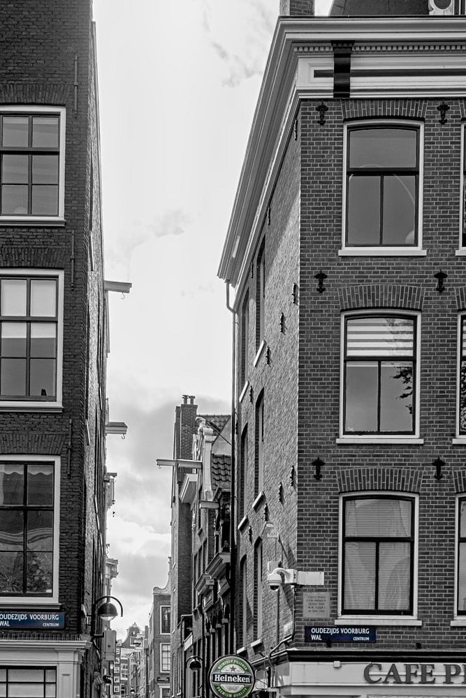 In the heart of Amsterdam opposite the Oudekerk is the Oudekennissteeg, a narrow street that connects the Oudezijds Voorburgwal with the Oudezijds Achterburgwal. On the left of this work is a beautiful canal house with a bell gable, on the right you can admire café Pleinzicht. This work can be ordered in both color and black and white.
