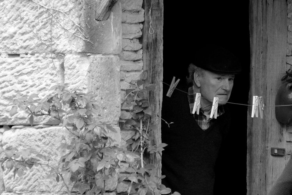 Oudere man heeft bij zijn huis een gesprek met een oudere dame. Sarlat - Frankrijk