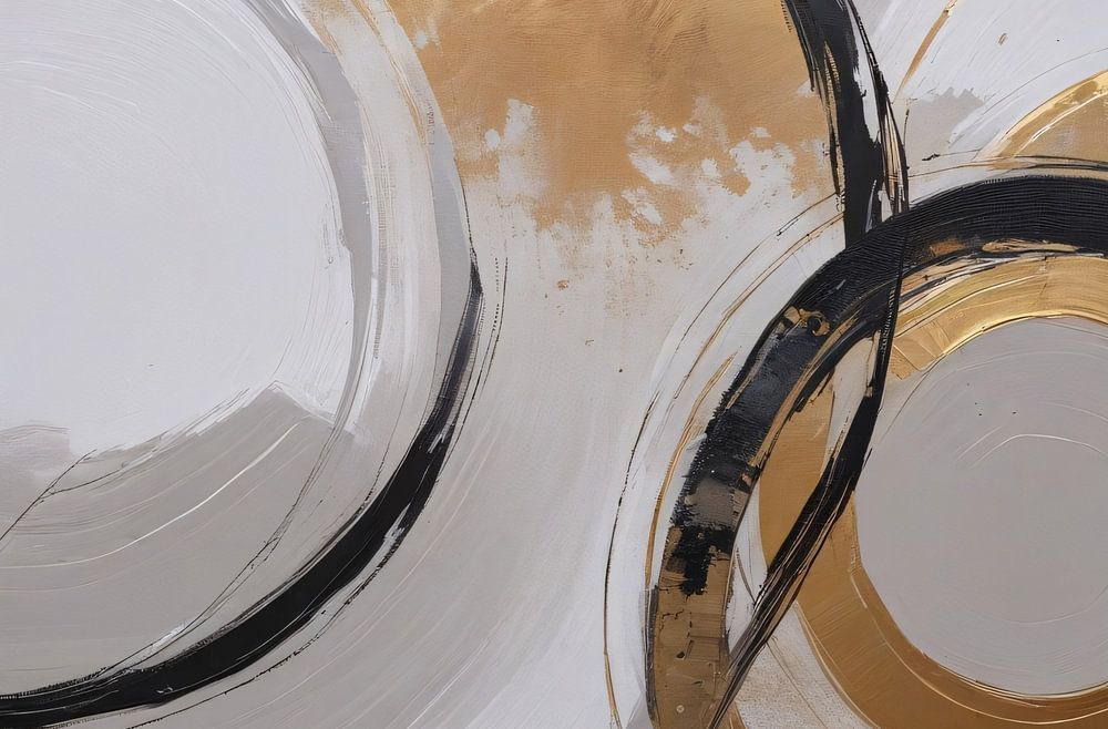 This stunning piece brings the essence of modern abstraction to your living space. The composition consists of overlapping circles with soft beige, gold and grey tones, interspersed with powerful black lines that create a dynamic contrast. The texture and use of light and shadow bring the circles to life, as if they were floating above the neutral background. Perfect for those who love a minimalist aesthetic but still want something unique that attracts attention. An asset for any wall in the modern home or office.