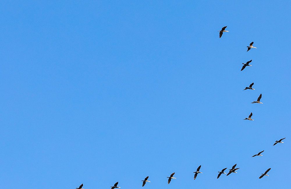 Birds fly in V form, this migration of a group of birds is beautifully captured in the blue sky.