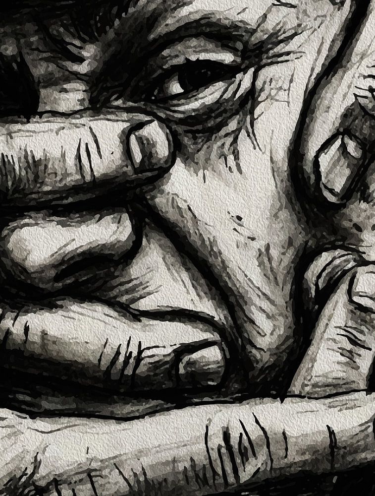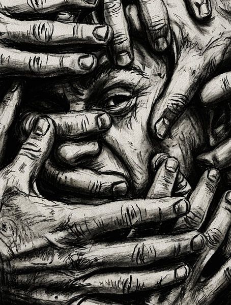 Dynamic charcoal illustration of a character’s face engulfed by grasping hands, visualizing the chaos of intrusive thoughts and external pressure. Designed for fans of dark, story‑driven, emotionally charged artwork.