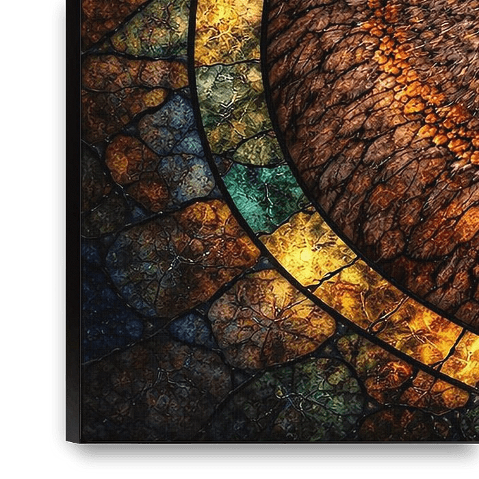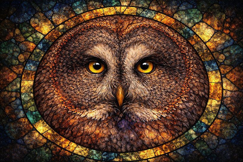 This stained-glass inspired portrait depicts the lapland owl as a timeless symbol. The geometric shapes and rich colours frame the characteristic wreath of feathers and enhance the hypnotic gaze. The work evokes associations with silence, wisdom and the sacredness of nature.