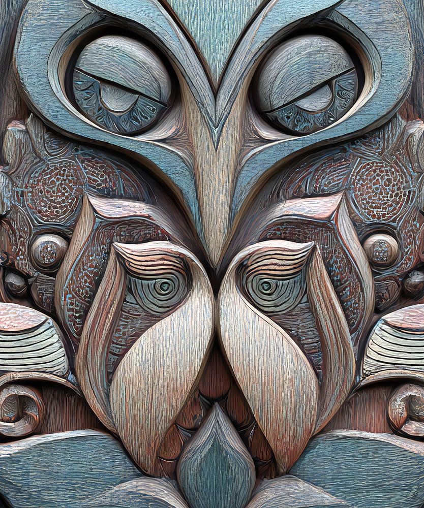 Abstract owl with soft taupe,grey and blue tones in the style of Haida art with paint on carvings.