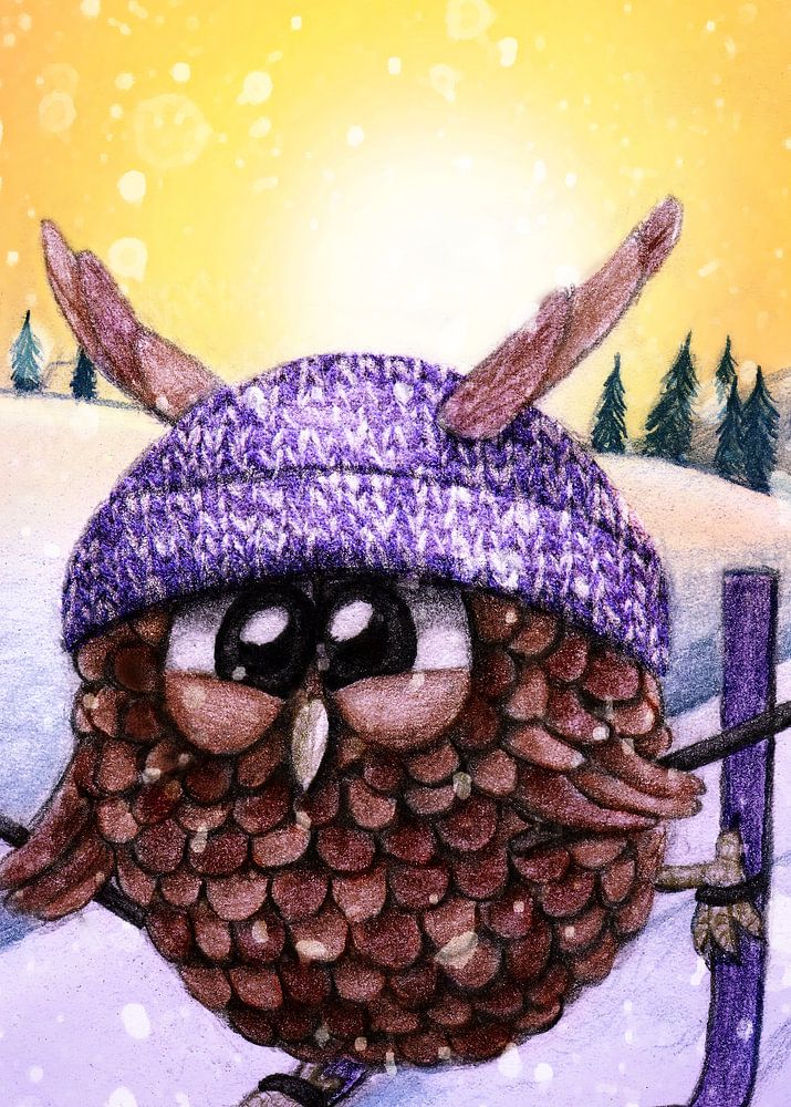 At a beautiful sunset this cheerful owl skis down the mountain.