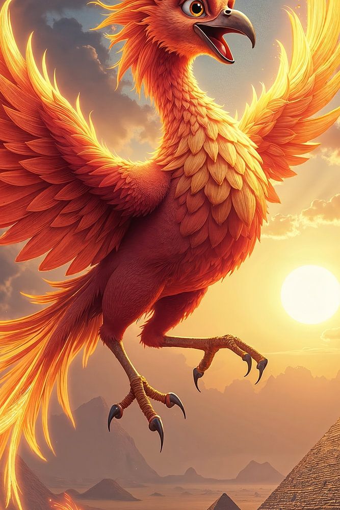 Above an endless golden desert landscape, a radiant phoenix rises into the sky, surrounded by warm sunlight and flowing flames that dance like living energy through the air. Its outstretched wings glow in intense colors, while the setting sun bathes the scene in a magical light. Between the mighty pyramids, this moment feels like a new…