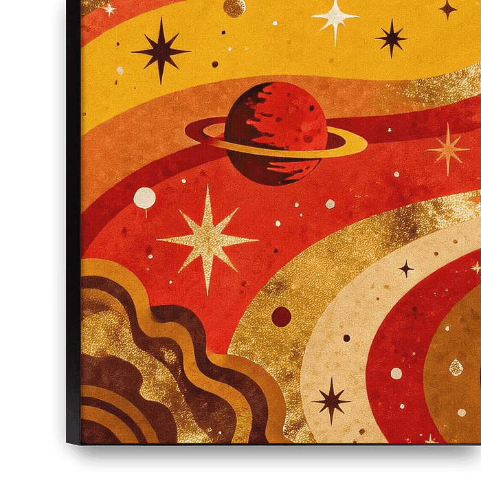 Embark on a celestial voyage with this mesmerizing PSYCHEDELIC-style cosmic art print. This masterpiece features a vibrant, swirling galaxy of flowing nebula waves in warm retro tones of amber, terracotta, and deep mahogany. Floating within this rhythmic space are stylized ringed planets and sparkling celestial stars that evoke the…