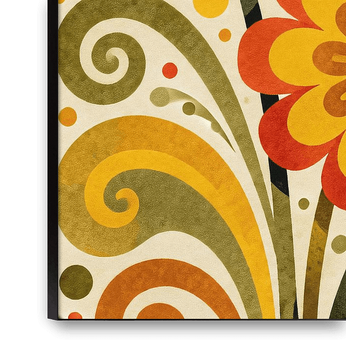 Bring a burst of nostalgic joy to your space with this vibrant PSYCHEDELIC-style floral art print. Inspired by the iconic "Flower Power" movement of the late 60s and 70s, this artwork features bold, stylized blossoms with intricate spiral patterns and playful swirling leaves. The warm palette of sun-kissed orange, golden yellow, and…