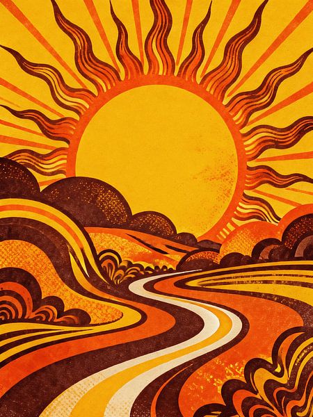 Step into a vibrant time machine with this breathtaking PSYCHEDELIC-style landscape art print. This piece captures a massive, radiant sun with flowing, wavy rays that dominate a brilliant yellow sky. Below, a rhythmic winding road leads the eye through a series of lush, undulating hills rendered in a bold palette of burnt orange, deep…