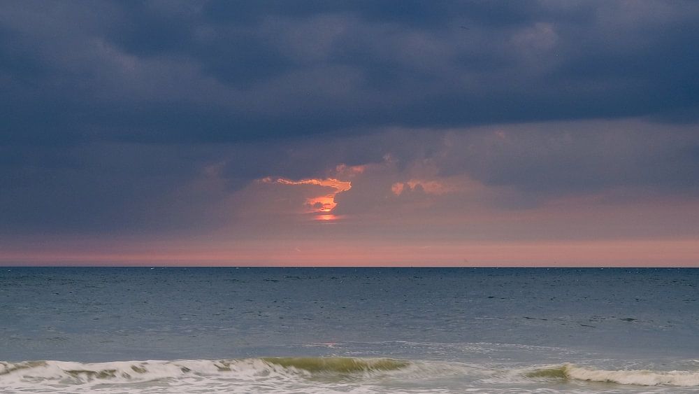 Pole at the beach of Petten at sunset and approaching thunderstorm and storm