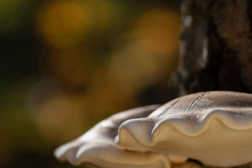Berkenzwam Piptoporus betulinus uit de familie Fomitopsidaceae in het avondlicht aan een berkenboom in de herfst