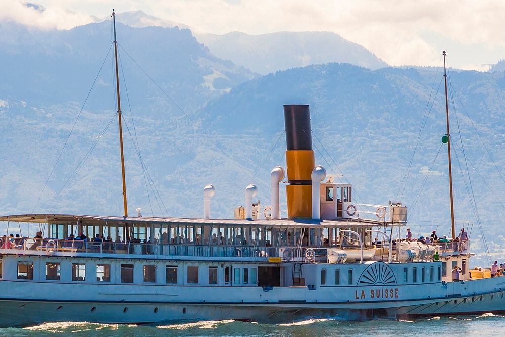 Historic paddle steamer La Suisse on Lake Geneva near Lausanne.