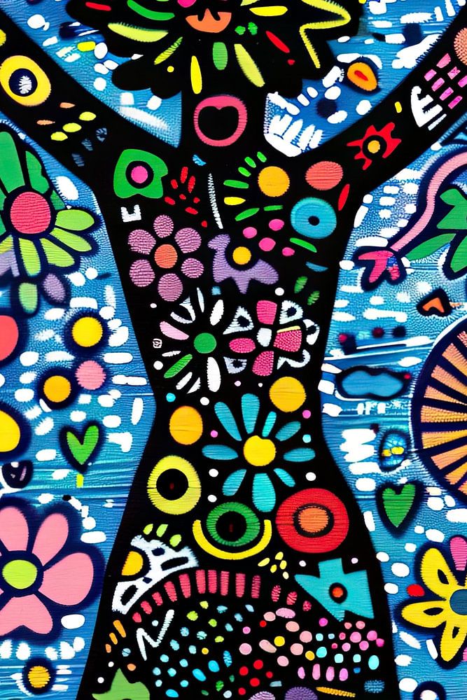 Details: dance, flowers, colourful, joyful, abstract, art, figure, hearts, circles, dots
