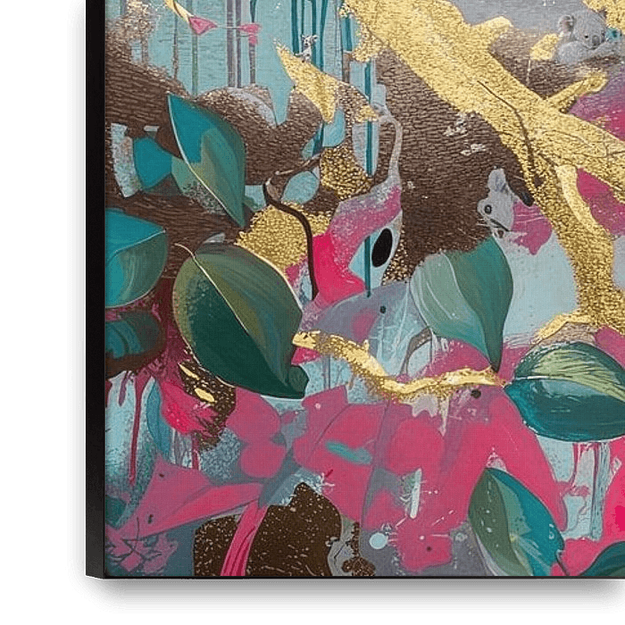 Details: koala, gold, leaves, colourful, nature, wild, abstract, modern art, animal, canvas