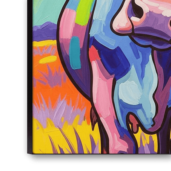 Colorful painting of a group of five cows standing in a field, with swirling brushstrokes in the sky.