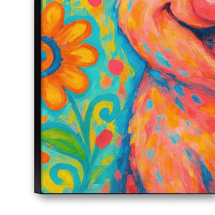 Colorful painting of a smiling pig. Background features swirling patterns and floral designs in vibrant colors.
