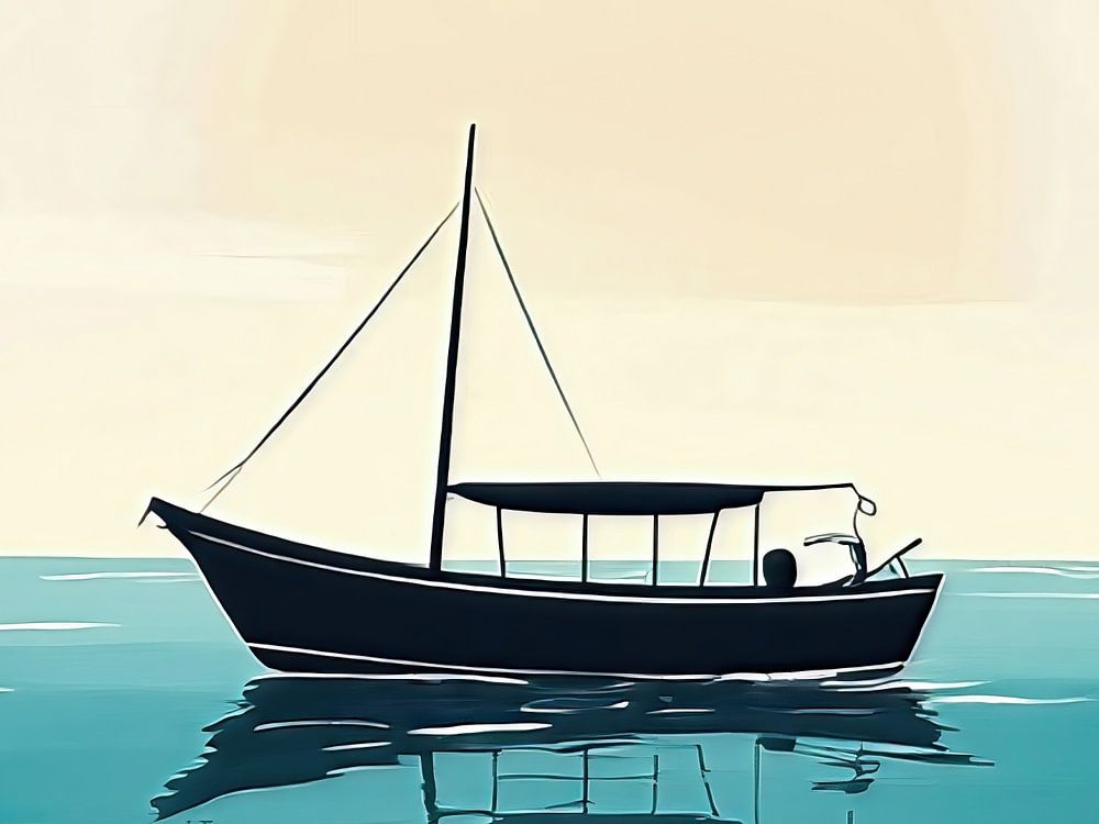 This minimalist illustration of a boat at sea exudes calm and simplicity. The small boat is sailing on a serene, vast sea, rendered with soft lines and limited colours. The calm composition and subtle details give the artwork a meditative feel, highlighting the endless space and silence of the ocean. Perfect for lovers of calm and minimalist art with an understated but meaningful look.