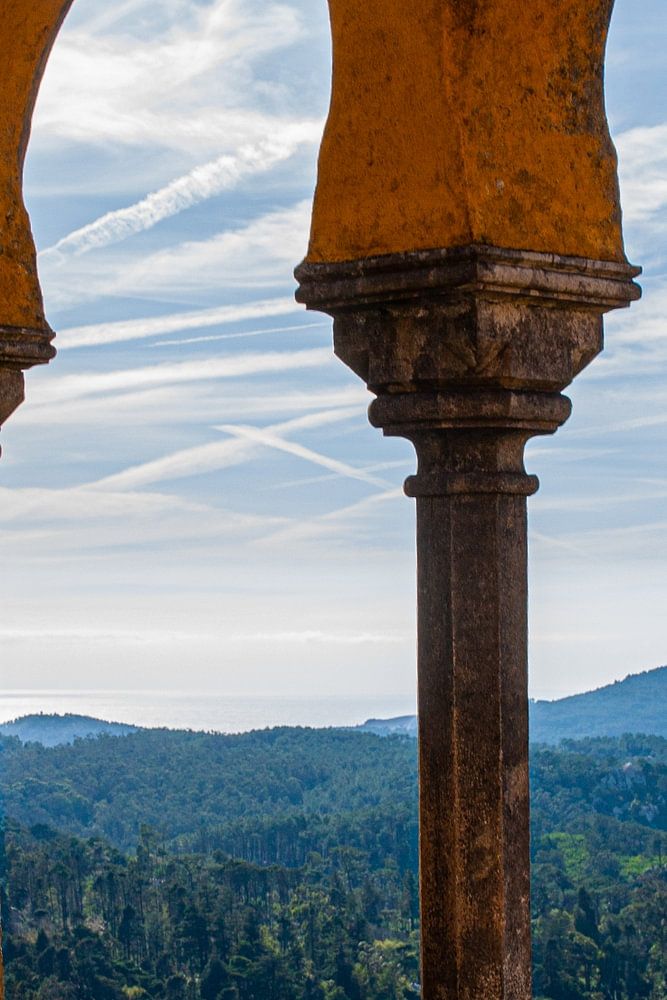 Palacio da Pena a beautiful colorful palace situated on a mountain in Sintra. Sintra is a beautiful town near Lisbon. Besides the beautiful architecture of this building you also have a beautiful view over the overwhelming nature of Portugal.
