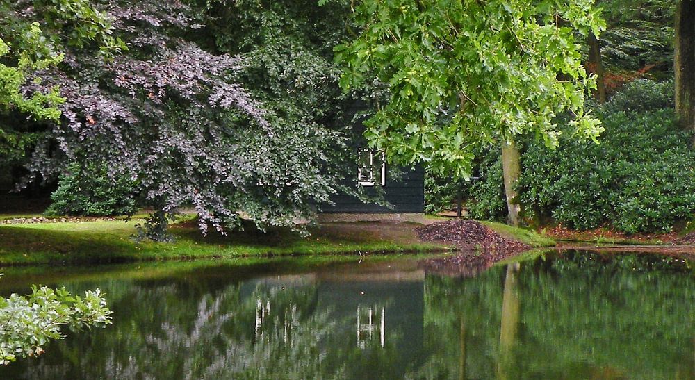 Bij Paleis Het Loo te Apeldoorn bevindt zich het schitterende Paleispark. In het heuvelachtige terrein wisselen mooie loofbossen af met schilderachtige vijvers en beekjes. In de achtergrond een theekoepeltje.