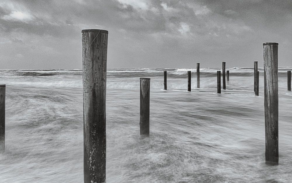 Palendorp in Petten is a work of art to symbolize the drowned Petten. 10 houses and a church. The photo was taken with a long shutter speed so you can see movement in the water.