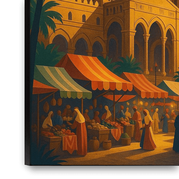 Buy this art deco artwork Palermo Art Deco Travel Poster – Sicilian Market and Cathedral by Travel Shop on canvas, ArtFrame, poster and wallpaper, printed on demand in high quality.