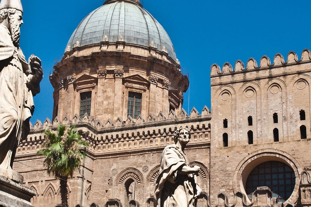 Palermo, with its imposing sights and oriental flair, has managed to counteract its bad image. Once considered a mafia stronghold, Palermo has awakened and transformed itself into a lively cultural city. One of the most important sights in Palermo is the cathedral. Shaped by Byzantine-Arabic-Norman influences, the most diverse architectural styles meet after rebuilding. The Maria Santissima Assunta Cathedral in Palermo on the island of Sicily is overwhelming. On Corso Vittorio Emanuele in a northerly direction, the right-hand side of the street widens into a huge square shortly before the Palazzo Reale. Here, the grandiose building is located on the edge of the old quarter Il Capo on the site of an old basilica from the 6th century. The church was converted into a mosque in 831 during the Saracen conquest of Palermo. Around 1072, the Normans reconsecrated the building as a Christian church and elevated Palermo to an archbishopric. In 1185, the cathedral was consecrated in the Byzantine-Arabic-Norman architectural style. Because of its construction, the cathedral is also known as the Norman Cathedral. The exterior façades of the cathedral, decorated with beautiful inlays of lava stone, reveal a harmonious fusion between Arabic and Norman architecture. For passionate lovers of architecture and art, an extended visit to the cathedral is truly inspiring enrichment. I took this delightful, photographically architectural shot of the magnificent cathedral from a mixture of building cultures in the heart of Palermo's city in July 2019 with the Nikon D90. The subject is ideally suited for hanging in architectural offices, but can also be a fascinating eye-catcher in living spaces.