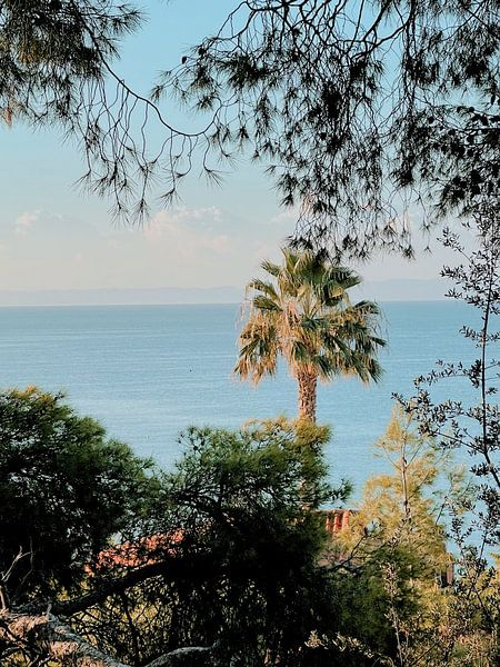 Buy this landscape artwork Palm Tree with Sea View – Greece by PhotoManiX Artworks on canvas, ArtFrame, poster and wallpaper, printed on demand in high quality.