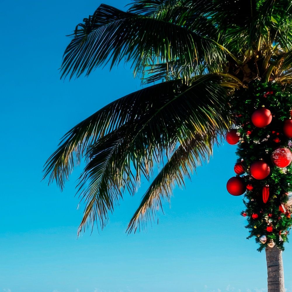 A bright blue sky embraces a majestic palm tree, adorned with bright red ornaments that create a festive atmosphere. The gentle shadow of the palm tree meets the fine sandy beach, while the waves murmur gently on the shore. This picture brings tropical holiday pleasures into the living room and creates an inviting, relaxing atmosphere.
