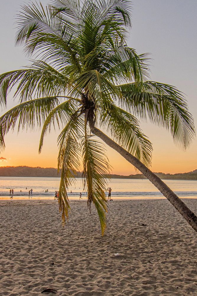 Palm tree in the sand on the beach in Costa Rica. In the background rocks, the sea and sunset