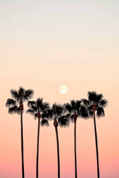 A soft pastel-coloured sky frames elegant palm trees whose silhouettes stand out against the rising disc of the moon. The harmonious combination of nature and light creates a dreamy atmosphere that invites you to linger. The contrast between the dark trees and the soft morning sky lends the moment an almost magical quality.