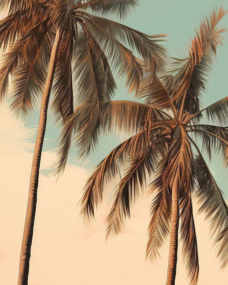 Palm Trees - This piece captures the serene look of two palm trees against a soft, Peach Fuzz sky, with the subtle orange tones creating a warm and inviting atmosphere. The stylised representation of the palms gives the piece an illustrative touch that feels both modern and timeless, perfect for a relaxed, natural atmosphere in any interior.