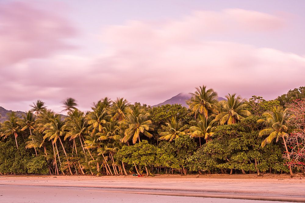 Het strand bij Cape Tribulation in Queensland met palmen onder een prachtige avondlucht.
