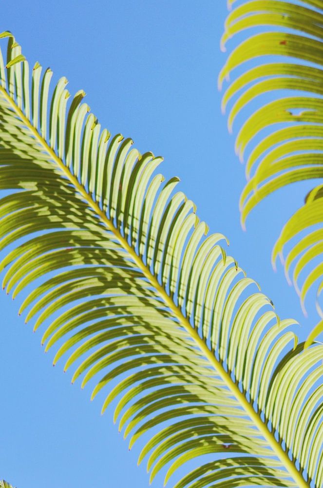 Palm branches in the afternoon sun on a California beach. A simple image of exotic and tropical vegetation, evoking the beach, rest and eternal summer, with a retro style given by soft colors.