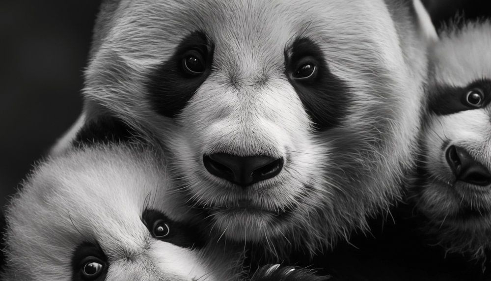 Panda family panorama black and white painting with a beautiful and unique style. With beautiful colour tones and a unique design, this makes a stylish photo print that looks great in any room. 100% unique and original!